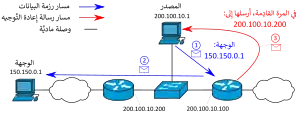 - إذا لم يكن بالإمكان بلوغ الشبكة المُحدَدة وجهةً لرزمة بيانات ما وفقاً لبنود جدول التوجيه. في هذه الحالة، يقوم الموجه بالتخلص من الرزمة، ويُرسل رسالة عدم بلوغ الوجهة ويُحددها بحالة حالة عدم بلوغ الشبكة.