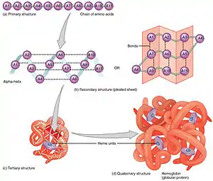 - بنية أولية: وهي تسلسل خطي لأحماض أمينية مرتبطة بواسطة رابطة ببتيدية في عديد ببتيد.[23]