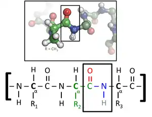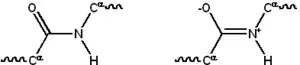 للرابطة الببتيدية بنيتا رنين تساهمان ببعض خصائص الرابطة المضاعفة وتمنعان الدوران حول محورها، وتكون فيهما الذرات المرتبطة بكربون ألفا على نفس المستوى تقريبا. تحدد الزاويتان الزوجيتان الأخرتان في الرابطة الببتيدية الشكل المحلي المتخذ من قبل العمود الفقري للبروتين.[4] تُعرف النهاية التي تحتوي على مجموعة أمينية حرة بالنهاية الأمينية أو النهاية N، في حين تسمى نهاية البروتين التي تحتوي على مجموعة كربوكسيلية حرة بالنهاية الكربوكسيلية أو النهاية C (يُكتب تسلسل البروتين من النهاية الأمينية إلى النهاية الكربوكسيلية، من اليسار إلى اليمين).