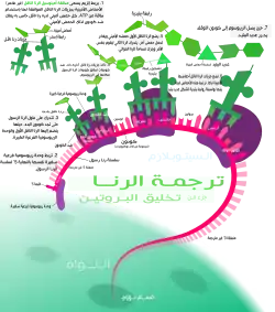 تُعرف عملية تخليق البروتين من الرنا الرسول بالترجمة، ويتم خلالها ارتباط الرنا الرسول بالريبوسوم حيث تُقرأ منه ثلاث نوكليوتيدات كل مرة وتتم مطابقة كل كودون بضد الكودون المقابل له والموجود في جزيء الرنا الناقل الذي يحمل معه الحمض الأميني الموافق للكودون الذي يتعرف عليه، يقوم الإنزيم مخلقة أمينوسيل الرنا الناقل "بتحميل" الرنا الناقل بالأحماض الأمينية الصحيحة.السلسلة الببتيدية النامية تسمى غالبا السلسلة الوليدة أو الناشئة. تُخلّق البروتينات دائما من النهاية-N نحو النهاية-C.[14]