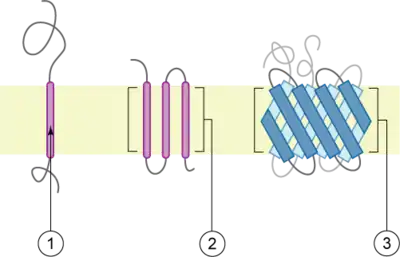 رسم يمثل أنواع مختلفة لبنى بروتينات عبر غشائية.