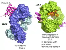 | بنية نطاقات البروتين A كحزمة لولب ثلاثي للسلسة الثقيلة المتغيرة لفاب VH3 البشري (يسارا).[1] بروتين A مصغّر مرتبط بشدفة Fc للريتوكسيماب (يمينا).[2] | |||||