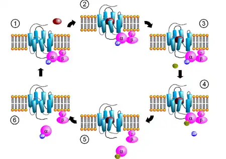 ترتبط البروتينات G المستقبلة مع السطح الداخلي للغشاء الخلية. وهي تتألف من Gα ووالوحدات الفرعية Gβγ المرتبطة ارتباطا وثيقا. هناك عدة فئات من الوحدات Gαالفرعية ومن بعض الأمثلة: G) Gsα المحفزة) , G) Giα المثبطة),G) Goα وغيرها) ,Gq/11α, G12/13α. أنها تتصرف بشكل مختلف في التعرف على الجزيء المؤثر، ولكنها تشترك بآلية تنشيط مماثلة.