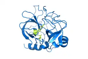 ![]() التركيب البلوري للكيموتربسين البقري. وتظهر بقايا الحفاز كما العصي الأصفر. المقدمة من 1CBW. | |||||||||