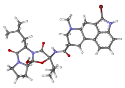 مثل كل الببتيدات ولهذا، بروموكريبتين هو دوراني cyclo. مجموعتين من الببتيد من ثلاثي الببتيد الخاص به شاردة ليتم الربط العبوري، وتشكيل ارتباط >N-C(OH)< بين الحلقتين مع مجموعة اميد وظيفية .