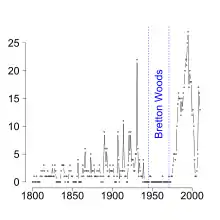 تم الاتفاق في تاريخ 1 إلى 22 يوليو 1944 بثبيت عملات أجنبية مقابل الدولار حيث تم تحديد الدولار بسعر 35 دولاراً مقابل أونس من الذهب. في عام 1967, رفض مصرف في شيكاغو منح قرضاً بالجنية الإسترليني لأستاذ جامعي اسمه ميلتون فريدمان لأنه كان ينوي استعمال الأموال لإنقاص العملة البريطانية. رفض المصرف منح القرض كان بسبب اتفاقية بريتون وودز.