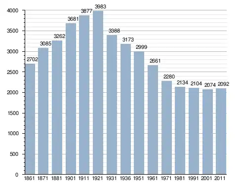 في سنة 1861 بلغ عدد السكان 2٬702 نسمة، وتطور العدد ليصل في سنة 2011 لـ 2٬092 نسمة.