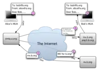 الشكل المقابل يوضح طريقة عمل البريد من خلال خطوات مرقمة، فعندما تريد إرسال رسالة فإنها تحتاح إلى برنامج عميل البريد مثل Microsoft outlook وتضع عنوان المستقبل وبعد أن تضغط زر إرسال يقوم برنامج العميل بتنسيق الرسالة على هيكل بريد إلكتروني ويكون على صيغة معينة وبعدها يقوم البرنامج بإرسال الرسالة بواسطة بروتوكول (بروتوكول إرسال البريد البسيط) إلى عميل الإرسال (خادم الرسائل (MTA وهو هنا smtp.a.org