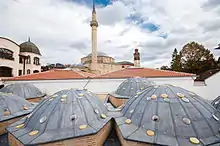 حمام بريشتينا الكبير (بالألبانية: Hamami i madh)، هو حمام يعود بناؤُه إلى القرن الخامس عشر في عهد السلطان مراد الثاني.[52][53] كان الحمام جُزءًا من مُجمع مسجد السلطان مُراد، وقد كان به حمامان متماثلان، أحدهما للنساء والآخر للرجال. يتألف الحمام من 15 قبة ذات ثقوب صغيرة تُستخدم لإنارة المكان من الداخل.[54] بعد حريق وقع في عام 1994، سُمح ببناء ثلاثة متاجر تسببت في إغلاق المدخل القديم للحمام.[53] ظل الحمام لسنوات عديدة مهجورًا، وقد تبقى منه عدد قليل فقط من الجُدران المليئة بالقمامة والأشجار الكبيرة والمياه العادمة التي تتدفق داخل المبنى.[55] ومع ذلك، خضع المُجمع لعملية ترميم.[52] |