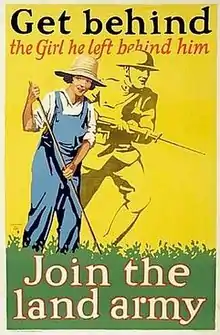 عندما استهدفت الحكومة النساء في وقت مبكر من الحرب ركزت على توسيع أدوار القائمة بينهما - مساعدة اللاجئين مع البلجيكي، على سبيل المثال، ولكن أيضا على تحسين معدلات التوظيف بين الرجال. فعلوا ذلك سواء من خلال ما يسمى ب "وسام الريشة البيضاء" وذلك من خلال وعد من وسائل الراحة المنزلية للرجال، بينما كانوا في الجبهة. في فبراير 1916، تم تعيين مجموعة صعودا وبدأت حملة للحصول على النساء للمساعدة في الزراعة ومارس 1917، تم تعيين الجيش لاند للمرأة يصل. كان هدف واحد لجذب الطبقة الوسطى النساء الذين يعملون كنماذج للمشاركة وطنية في الواجبات غير التقليدية. لكن زي الجيش البري المرأة شملت سراويل نصف وزرة الذكور، الأمر الذي أثار النقاش حول مدى ملاءمة هذا عبر خلع الملابس. وردت الحكومة مع الخطاب الذي تأنيث صراحة الأدوار الجديدة. في عام 1918، ويقدر مجلس التجارة أن هناك 148,000 النساء في العمل الزراعي، على الرغم من الرقم ما يقرب من 260,000 كما تم اقتراح. [44]