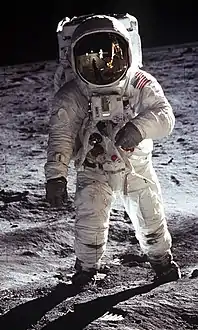 صورة لرائد الفضاء بز ألدرن التقطها له نيل أرمسترونغ خلال الهبوط الأول على القمر يوم 20 تموز (يوليو) عام 1969م.