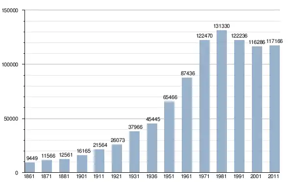 في سنة 1861 بلغ عدد السكان 9٬449 نسمة، وتطور العدد ليصل في سنة 2011 لـ 117٬166 نسمة.