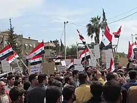 بدأت الاحتجاجات الجماهيرية في سوريا في 26 يناير 2011. ودعا المتظاهرون إلى إجراء إصلاحات سياسية واستعادة الحقوق المدنية، فضلا عن إنهاء حالة الطوارئ التي كانت قائمة منذ عام 1963.[75] تم تحديد محاولة واحدة في "يوم الغضب" في الفترة من 4 إلى 5 فبراير، على الرغم من أنها انتهت بشكل هادئ.[76] وكانت الاحتجاجات التي جرت في 18–19 مارس هي الأكبر في سوريا منذ عقودفي سوريا منذ عقود، وردّت السلطة السورية بالعنف ضد مواطنيها المحتجين.[77]