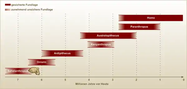في الأعلى نجد الأحفورات التي عثر عليها وتشير إلى قبيلة البشراناوية. وأسفل منها أحفورات للأجناس الأخرى الأقدم منها . اللون البني الغامق يدل على استنتاجات مؤكدة. وأما اللون البني الفاتح فهي تشير إلى نتائج غير موثقة.