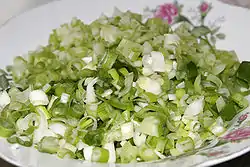 يتم حصده لمذاقه وهو أكثر ليونة من معظم أنواع البصل. ويمكن طهيه أو استخدامه نيئًا كجزء من السلطة، صلصة، أو (Asian cuisine) الوصفات الآسيوية. البصل المكعب يستخدم في الشربة (soup)، وبعض أنواع المكرونة وطعام البحر، وكذلك السندويتشات وبهار الكري (curries) أو كجزء من المقليات. وفي العديد من الصلصات الشرقية، تتم إزالة ربع بوصة من قاع جذور البصل قبل الاستخدام.