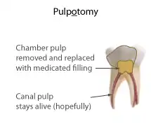 |CitationClass=تم تجاهله (مساعدة) - "What Is a Pulpotomy?". Verywell Health (باللغة الإنجليزية). مؤرشف من الأصل في 28 أكتوبر 2020. اطلع عليه بتاريخ 29 ديسمبر 2020. الوسيط