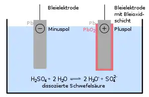 وطبقا لسير ذلك التفاعل من اليسار إلى اليمين أثناء تشغيل البطارية يتحول كلا من الرصاص وأكسيد الرصاص بالتفاعل مع حمض الكبريتيك إلى كبريتات الرصاص وينتج عن ذلك ماء وطاقة كهربية، ويسير التفاعل من اليمين إلى اليسار أثناء شحن البطارية بوساطة مصدر كهربائي خارجي.