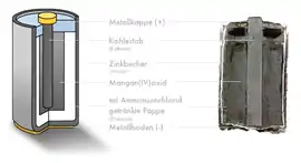 - Stiftung Warentest - test.de, 02/2006: Batterietypen: So entsteht der Strom für unterwegs, mehrfarbiges Schnittbild zum Vergleich von „Zink-Kohle-Batterie“=Zink-Braunstein-Zelle und Alkali-Mangan-Batterie, aufgerufen 7. August 2012 "نسخة مؤرشفة". Archived from the original on 27 أبريل 2020. اطلع عليه بتاريخ 28 مايو 2020. الوسيط