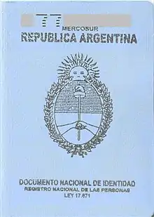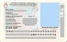بطاقة الهوية الأرجنتينية (بالإسبانية:Documento Nacional de Identidad أو DNI)[1] (أي وثيقة الهوية الوطنية)[2] هي بطاقة هوية الرسمية للمواطنين الأرجنتينيين, وكذلك الأجانب المقيمين المؤقتين أو الدائمين. يتم إصداره عند ولادة الشخص، ويجب تجديده في سن الثامنة والرابعة عشر سنة، وبعد ذلك كل خمسة عشر سنة في شكل واحد: بطاقة (DNI tarjeta); يكون صحيحًا إذا كان صاحب الهوية مطلوبًا، وهو مطلوب للانتخاب. يتم إنتاجها في مصنع خاص من قبل السجل الوطني الأرجنتيني للأشخاص (ReNaPer).