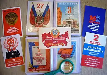 تُسمى عادة بطاقات الناخبين في اتحاد الجمهوريات السوفيتية الاشتراكية بطاقات "الكل يأتي للتصويت" ((بالروسية: ”открытки «Все на выборы»“)) لأنه خلال فترة الاتحاد السوفيتي كانت البطاقات تحمل نقشًا به شعار "الكل يأتي للتصويت". وعادة ما كان أحد جانبي بطاقات دعوة الناخبين هذه يحتوي على ميزات فنية في حين أن الجانب الآخر كان يحتوي على المعلومات. وكان النص الموجود على بطاقات الناخبين أثناء الحقبة السوفيتية يحمل عناصر ثابتة: كلمات "عزيزي الرفيق (Dear comrade) _____________. يُرجى تذكر أنه في يوم الأحد....." وكان هناك نداء للحضور والتصويت لصالح مرشحي الكتلة الانتخابية من الشيوعيين والمستقلين. وجرى إرسال بطاقات دعوة الناخبين باسم "ممثلي الأوصياء على مؤتمر عمال حملة الانتخابات" وفريق عمل الحملة، وكانت دائمًا تتميز بدعاية الحملة الانتخابية ونداء للاقتراع لمرشحي الكتلة الانتخابية للشيوعيين والمستقلين.
