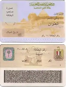 بطاقة الرقم القومي (أو بطاقة تحقيق الشخصية) تصدر لكل من بلغ السادسة عشر عاماً، وتستخرج من القسم التابع له المواطن[6]، والجهة المصدرة لتلك البطاقة هي مصلحة الأحوال المدنية بوزارة الداخلية، تحوي التفاصيل الشخصية لحاملها، فهي تحمل على وجهها: الصورة الفوتوغرافية والاسم بالكامل وعنوانه كاملاً ومحافظته وتاريخ ميلاده ورقمه القومي، وتحمل على ظهرها: الجنس والوظيفه والحالة الإجتماعية والديانة، وكذلك تاريخ اصدار البطاقة وتاريخ انتهائها والرقم القومي، وهي سارية لمدة 7 سنوات، ويتم استخراجهالأول مرة بالتوجه للقسم التابع له المواطن برفقة ولي أمره ومعه الاوراق المطلوبة لإستخراجهانص الصفحة.[7]، ولتجديدها يمكن للمواطن التوجه للقسم التابع له أو يمكنه استخراجها الكترونياً عبر موقع مصلحة الاحوال المدنية لوزارة الداخلية.[8][9]