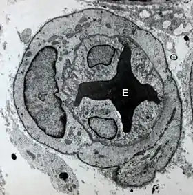 ![]() خلايا البطانة الغشائية التي تكون الغلالة الباطنة، أو الطبقة الداخلية في الأوعية الدموية، والتي تحيط بكرية دم حمراء (E). خلايا البطانة الغشائية التي تكون الغلالة الباطنة، أو الطبقة الداخلية في الأوعية الدموية، والتي تحيط بكرية دم حمراء (E). | |