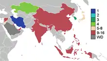 | شرق آسيا (2+2+1) | الخليج (2+1) | آسيا الوسطى (2) | جنوب شرق آسيا (2) | غرب آسيا (2+2) |