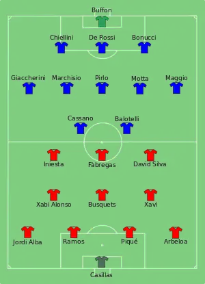 |CitationClass=تم تجاهله (مساعدة) - "التشكيلة التكتيكية – المجموعة الثالثة – إسبانيا-إيطاليا" (PDF). UEFA.com. الاتحاد الأوروبي لكرة القدم. 10 يونيو 2012. اطلع عليه بتاريخ 10 يونيو 2012. الوسيط