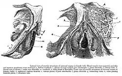 ![]() التشريح الداخلي لفرج المرأة، نجد البظر إلى الأعلى | |