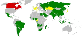 | مع (25) | الأرجنتين، البحرين، بنغلاديش، بوليفيا، البرازيل، تشيلي، الصين، كوبا، جيبوتي، مصر، غانا، الهند، إندونيسيا، الأردن، موريشيوس، نيكاراغوا، نيجيريا، باكستان، الفلبين، قطر، روسيا، المملكة العربية السعودية، السنغال، جنوب أفريقيا، وزامبيا.[62] |