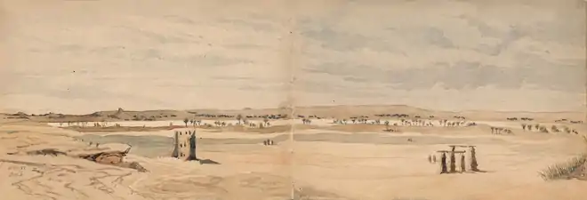 | كان الحجيج يخيمون على بعد كيلومتر واحد تقريباً إلى الشمال-الشرقي على هضبة من الصخر العاري يدعى قطيان. |