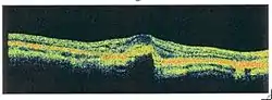 ![]() تصوير مقطعي بصري (OCT) للشبكية، يُظهر بقعة فوكس. تصوير مقطعي بصري (OCT) للشبكية، يُظهر بقعة فوكس. | |