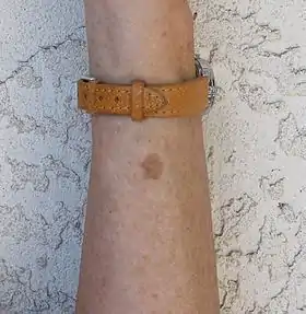 ![]() بقعة كبدية أو نمش شيخوخي ذات قطر 10مم على ذراع امرأة تبلغ من العمر 66 عاماً. | |