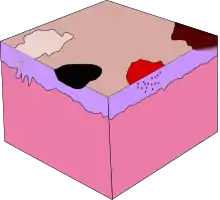 هذا النوع من الآفات يمكن ملاحظته بسبب لونه المختلف عن المنطقة المحيطة من الجلد،[3] كما أن اللون قد يكون مثلا أزرق أو أبيض أو أحمر.[2] وقد تنتج البقع بسبب زيادة التصبغ أو نقص التصبغ أو مشاكل وعائية أو حمامى أو فرفرية.[4]
