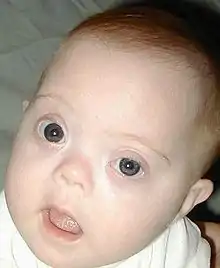 طفل بـ متلازمة داون ويظهر بالعيون كلا من بقع بروشفيلد و تغايرالتلون .