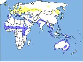 ![]() Distribution of Black-tailed Godwit: blue=winter- and staging area, yellow=breeding area, green=both, resident | |
