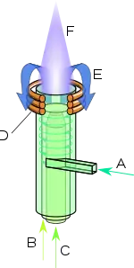 هناك ثلاثة أنماط من الأشكال الهندسية لمولدات البلازما المقترنة بالحث، وهي المولدات المستوية؛ والأسطوانية؛[2] ونصف الحلقية.[3] يعتمد المبدأ في مشعل البلازما على وجود ملف حث معدني (D) يمر به تيار كهربائي ويكون ملفوفاً حول أنبوب من الكوارتز يتألف من طبقتين، تكون الطبقة الخارجية (B) مخصصة لتمرير غاز التفريغ والذي عادة ما يكون من غاز الآرغون، والتي تبرد بتمرير غاز تبريد (A) فيها؛ كما توجد طبقة داخلية (C) يمر فيها الغاز الحامل للعينة عادة؛ وتلتقي الطبقتان عند نقطة بالقرب من ملف الحث حيث يوجد حقل مغناطيسي قوي (E)؛ مما يؤدي إلى توفير شروط ملائمة من أجل توليد شعلة البلازما (F).[4]