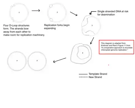 وحتى الآن لم يستكشف تماما كيف يتم الانقسام. وكثرت محاولات الاستكشافات منذ عام 1970، والآن ترشح إحدى الطرق لتكون هي الطريقة السليمة التي تتم بها عملية الانقسام لكن أحد الطرق ركزت على مشاهدة الانقسام بواسطة المجهر الإلكتروني، وهي مرشحة لتكون هي الطريقة الحقيقية للانقسام. [10][11] ونتيجة المشاهدة بالمجهر الإلكتروني ملخصة في الشكل 3؛ وفيها يحدث انزياح في الدنا يسمى انزياح حلقي مزدوج D-loop. وتنزاح خلاله عقدتين من الدنا وتأخذان شكل حرف theta (θ) من الكتابة اليونانية، وتبتعدان عن بعضهما البعض (أنظر الشكل 3). [10][12] ثم تتم عملية نسخ الدنا. ومع استمرار العملية ينفصل المركب cpDNA الجديد مكونا خلية ثانية بنفس كروموسومات الخلية الأم.