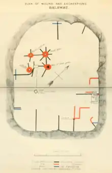 تم التنقيب في الموقع عام 1878 من قبل عالم الآثار هرمز رسام.[3][4] تم التنقيب في الموقع مرة أخرى بواسطة ماكس مالوان لصالح المعهد البريطاني لدراسة العراق عام 1956.[5] تم إجراء مسح سطحي بواسطة د. ج. تركر في عام 1989 للمتحف البريطاني. أحاطت أسوار البلدة بمساحة 64 هكتار.