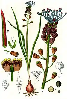 يبلغ طولها حتى 30 سنتمترا أصولها بصلة صغيرة اوراقها قرصية تنطلق من البصلة. ازهارها عناقيد مستطيلة أو جحالية الشكل يحملها شمراخ اجوف منها العقيمة و منها الخصبة بنفسجية اللون اسطوانية النورة و ثمارها حقق تحمل بذورا كروية الشكل.[3][4]