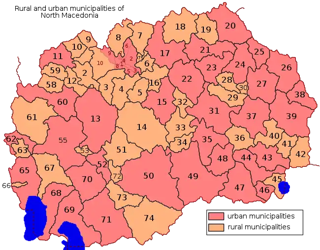 خريطة البلديات لجمهورية مقدونيا، مع مدينة سكوبجي برمز 1 على الخريطة باللون الاحمر. الخريطة توضح البلديات الريفية والحضرية. اللون الاحمر يمثل البلديات الحضرية والبرتقالي يمثل البلديات الريفية. الرقم على الخريطة يمثل الرقم على الجانب الأيمن لاسم البلدية في الجدول اسفل الخريطة، والرقم الثاني يمثل بلديات مدينة سكوبجي 1.س حيث تمثل س رقم البلدية في مدينة سكوبجي باللون الاحمر.