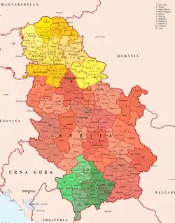 من اجمالي 150 بلدية 41 منها تقع في جنوب وشرق صربيا و 42 في شوماديا Šumadija وغرب صربيا و 39 في فويفودينا Vojvodina و 28 في كوسوفو ( في الواقع 37 ) Kosovo . من 24 مدينة 6 منها في جنوب وشرق صربيا و 10 في شوماديا و غرب صربيا و و 6 في فويفودينا و واحدة في كوسوفو و واحدة ( بلغراد Belgrade ) لها وضع خاص كمنطقة إحصائية.[1]