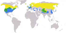 تتكاثر في المنطقة حول القطبيّة من الإقليم الشمالي التامّ عند الأنهار والمياه العذبة، وخصوصاً في الغابات. تشتو أساساً جنوباً على المسطحات المائية العذبة والقليلة الملوحة المكشوفة.