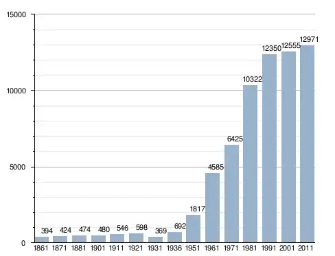 في سنة 1861 بلغ عدد السكان 394 نسمة، وتطور العدد ليصل في سنة 2011 لـ 12٬971 نسمة.