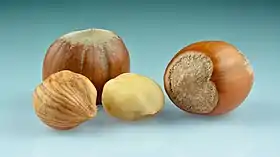 ![]() حبتا بندق، بندقة بقشرة (يساراً)، بندقة بدون قشرة (يمينا) | |