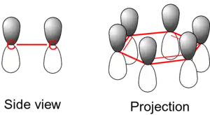 تتكون الروابط الأحادية من الإلكترونات الموجودة بين ذرات الكربون – ويطلق عليها سيجما σ. وتتكون الروابط الثنائية من رابطة سيجما، ورابطة أخرى تسمى رابطة باي. وهذه الرابطة الثانية لها إلكترونات تدور في مدارات أعلى وأسفل مستوى الحلقة عند كل ذرة كربون مرتبطة. وتتكون الروابط باي من مدار p الذري أسفل وأعلى مستوى الحلقة. والشكل القادم يوضح مكان هذه المدارات.