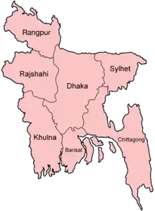 تنقسم بنغلاديش إلى ثمان مقاطعات إدارية ويتم تسمية كل منها على اسم المركز الرئيسي الخاص بها وهي: باريسال (বরিশাল) وشيتاجونج (চট্টগ্রাম) وداكا (ঢাকা) وخولنا (খুলনা) وراجشاهي (রাজশাহী) وسيلهتসিলেট)r )ورانجبور( রংপুর)وميمينسينغ (ময়মনসিংহ)