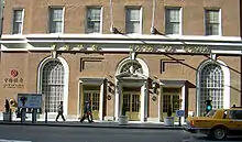 - لدى بنك الصين، نيويورك موقعان: 410 Madison (مفتوح من الاثنين إلى الجمعة) و 42 East Broadway (مفتوح لمدة سبعة أيام). تعمل أيضًا كمركز لتبادل المعلومات على مدار الساعة طوال أيام الأسبوع عن التحويلات البنكية وإيقاف الدفعات (مما يتيح الدفع في الوقت الفعلي إلى الصين).