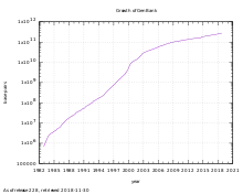 تشير ملاحظات بنك الجينات للإصدار 162.0 (أكتوبر 2007) إلى أنه "من 1982 إلى الوقت الحاضر، تتضاعف عدد القواعد في بنك الجينات كل 18 شهرًا تقريبًا". [4] [8] اعتبارا من 15 يونيو 2019 ، يحتوي بنك الجينات الإصدار 232.0 على 213,383,758 loci ، 329,835,282,7070 من القواعد، من 213,383,758 تسلسل تم الإبلاغ عنه. [4]