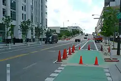 ويفصل طرق الدراجات عن طرق السيارات بصبغ بالوان مختلفه وهذا موجود بكل من المدن أمريكا وأوروبا.